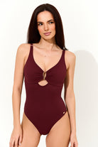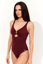 Design chic cu decupaj şi accesoriu auriu central – adaugă un plus de rafinament şi senzualitate.