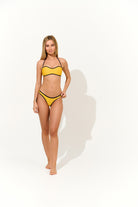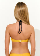 Sutien tip bandeau cu monocupă interioară, realizat din tricot texturat în dungi fine, cu susținere ușoară și bretele detașabile pentru un bronz uniform. Se leagă la spate, oferind un fit reglabil și stabil.